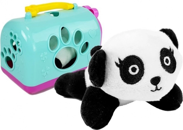 La panda de peluche mide 13,5 cm x 9,5 cm x 7 cm, mientras que la caja de transporte mide 15 cm x 8,5 cm x 11 cm.