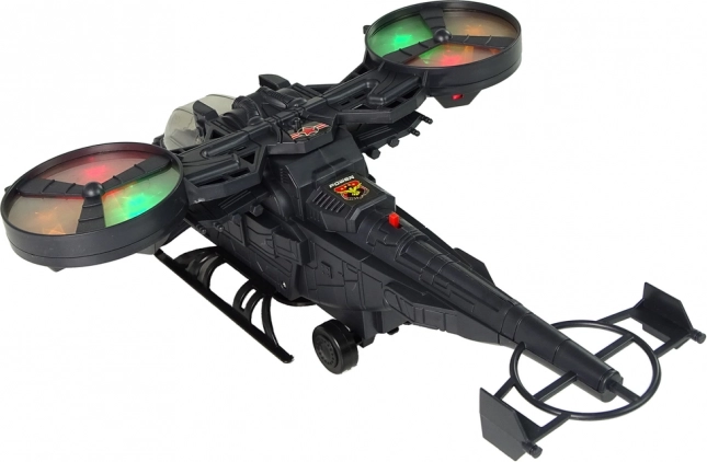 El helicóptero tiene grandes hélices giratorias que se iluminan en varios colores y se complementan con efectos sonoros que imitan el arranque y los disparos. Gracias a las ruedas situadas en la parte inferior, el helicóptero puede desplazarse por el suelo.