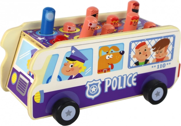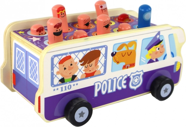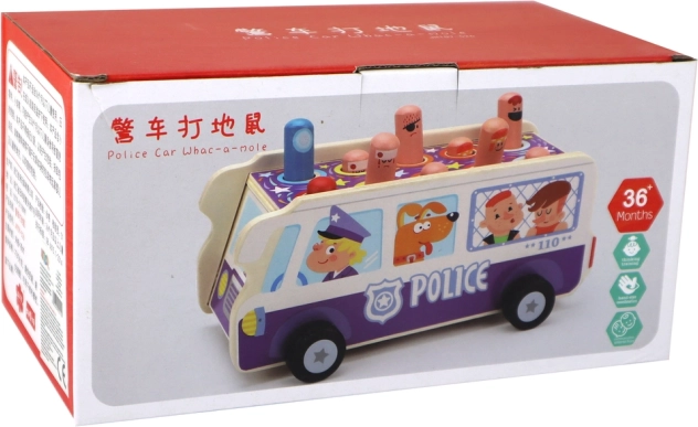 Divertido juego de habilidad de madera en forma de autobús de policía que desarrolla la motricidad fina, la coordinación ojo–mano y los reflejos rápidos. Los niños “golpean” con el martillo las figuras que saltan y, gracias a las ruedas, también disfrutan conduciendo el autobús. Fabricación en madera de calidad, materiales seguros, certificación CE y conformidad con la EN71 para un juego infantil tranquilo.