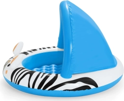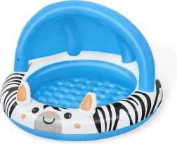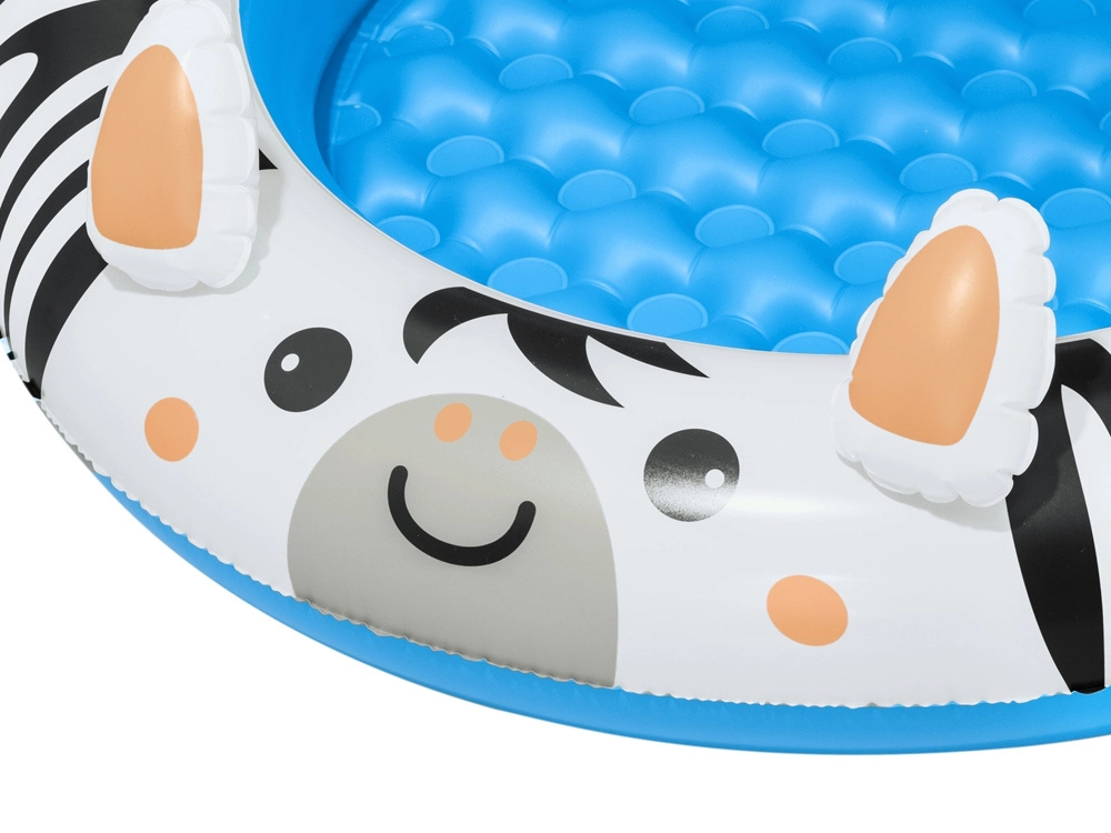 La gráfica animal en azul y blanco con rayas de cebra atrae la atención y fomenta un ambiente lúdico en cada chapoteo.