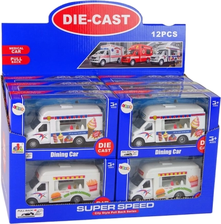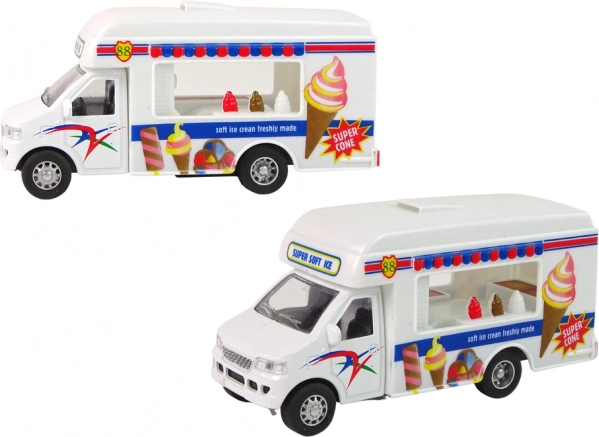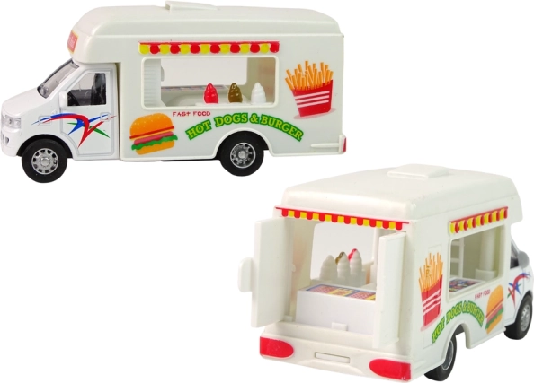 El set incluye dos modelos de autocaravanas. Una funciona como heladería y la otra como comida rápida. Conviértete en el conductor que alegra a cada niño con deliciosa comida. Las autocaravanas son de color blanco y están decoradas con pegatinas características para cada modelo.