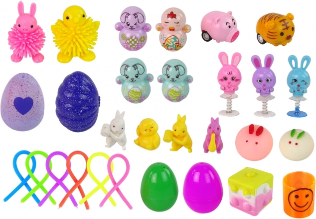 - cubo sensorial, cubo plegable, 4 figuras (conejo, pollito), 6 figuras de plástico (conejo, pollito), juego de tres en raya, 2 conejos para apretar, 6 serpientes de goma, 3 juguetes saltarines, 2 sorpresas en huevo, 2 cochecitos de arrastre (tigre, cerdito), muelle, 2 rompecabezas desplegables en huevo, 2 conejos de goma antiestrés, juguete desplegable, llavero conejo pop it
