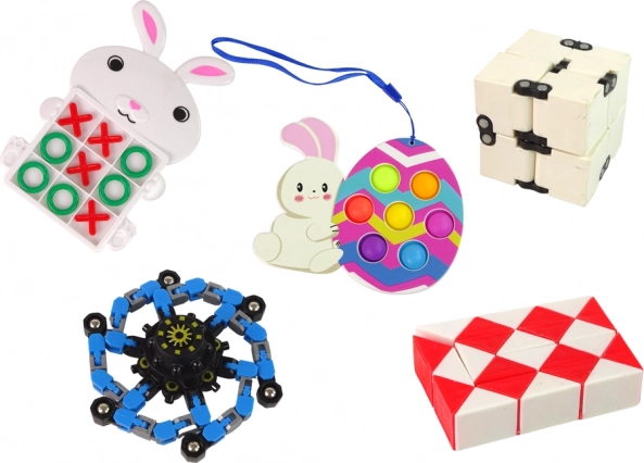 Este set temático de Pascua ofrece una variada mezcla de juguetes antiestrés y sensoriales que se pueden apretar, estirar, plegar y hacer clic. Ayudan a los niños a mejorar la coordinación ojo–mano, la creatividad y el pensamiento lógico, a la vez que favorecen la concentración y la calma durante el juego.