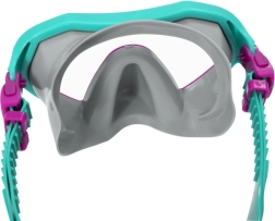 La máscara ofrece un amplio campo de visión gracias a las lentes de policarbonato con protección UV; el sellado de silicona suave se ajusta perfectamente al rostro y la correa ajustable garantiza estabilidad. El tubo con boquilla ergonómica de silicona está equipado con válvula de purga y rompeolas para evitar la entrada de agua. Las aletas con correa ajustable en talla 37–41 ayudan a un aleteo eficiente y a un movimiento fácil en el agua.