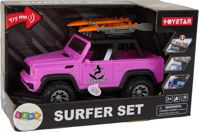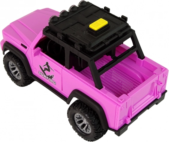 Disfruta del ambiente veraniego con este vehículo off‑road rosa de temática surf. Los detalles realistas, las ruedas grandes y el motor de inercia garantizan una conducción suave, mientras que las luces y los sonidos convierten cada recorrido en una aventura. Las tablas de surf y los remos en el portaequipajes del techo estimulan la imaginación e invitan a crear historias de playa.