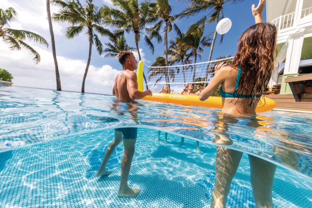En la caja encontrarás el marco flotante, la red, un balón de voleibol inflable y un parche de reparación: solo hay que inflar y jugar.