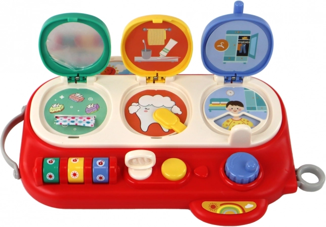 Esta tabla compacta (23 × 15 × 5 cm) combina aprendizaje y juego. Los niños pueden explorar tres ventanitas de colores con tareas únicas: la verde con un “secreto” con código, la amarilla con un motivo de diente y un cepillo móvil para practicar la higiene, y la azul con ropa intercambiable en una rueda giratoria. En la parte superior no falta el indicador de día y noche, que introduce el tiempo de forma amena.