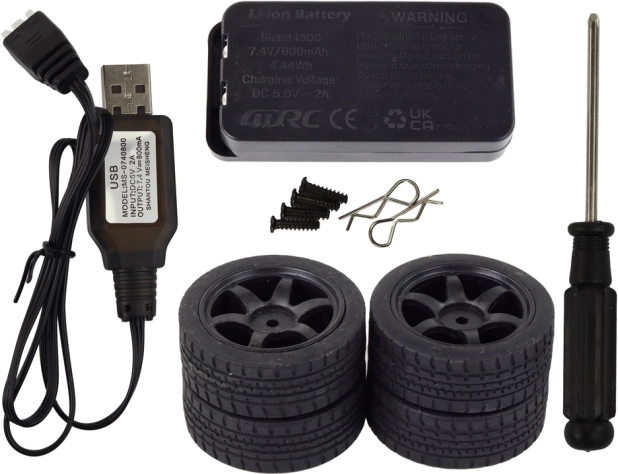 Conducción cómoda con volante y gatillo de aceleración, transmisión estable sin interferencias y prácticos complementos: cargador USB, batería Li‑ion, neumáticos de repuesto y herramientas.