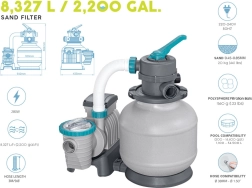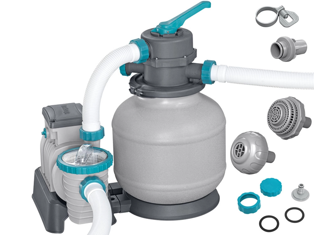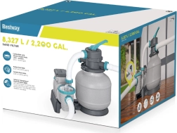 El potente filtro de arena BESTWAY con caudal de 8327 l/h mantiene el agua de la piscina cristalina. Ofrece válvula multifunción de 6 posiciones, manómetro para un control sencillo de la presión y temporizador automático. Compatible con arena de sílice de 0,45–0,85 mm y bolas filtrantes, ideal para piscinas con un volumen de 1 100–54 500 l.