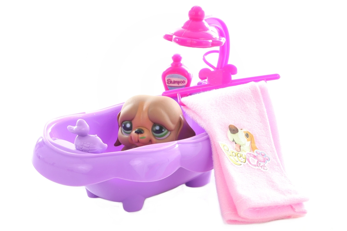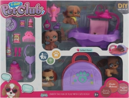 Este colorido set de perritos con accesorios convierte la habitación infantil en un pequeño salón de belleza y cuidado animal. Los niños pueden bañar a sus perritos en la bañerita, secarlos con la toalla, alimentarlos y acomodarlos en la suave camita escondida en el práctico maletín. Todo está hecho de plástico resistente y adaptado a las manitas de los niños.