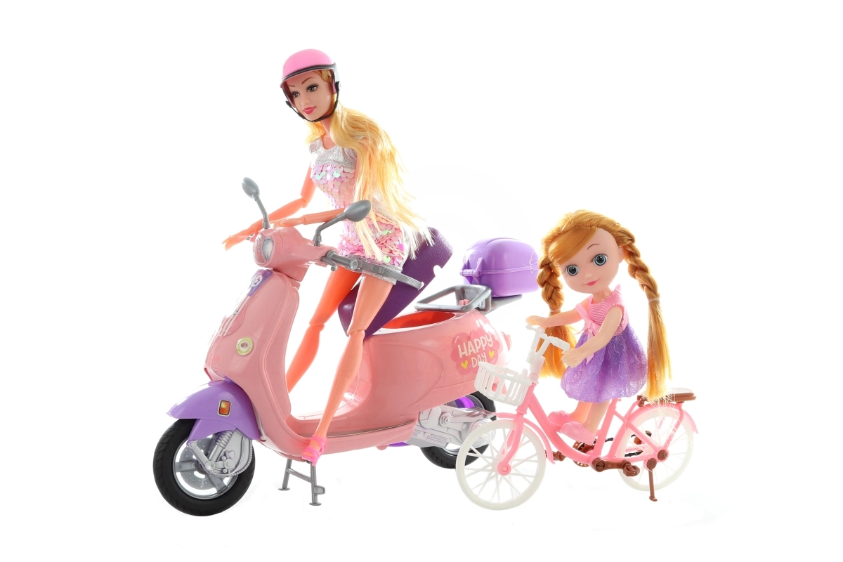 - Muñeca grande de 30 cm (articulada), muñeca pequeña de 16 cm, coche de 33 cm, scooter de 30 cm, bicicleta de 17 cm, columpio, perrito, sombrero, casco, bolsa de la compra