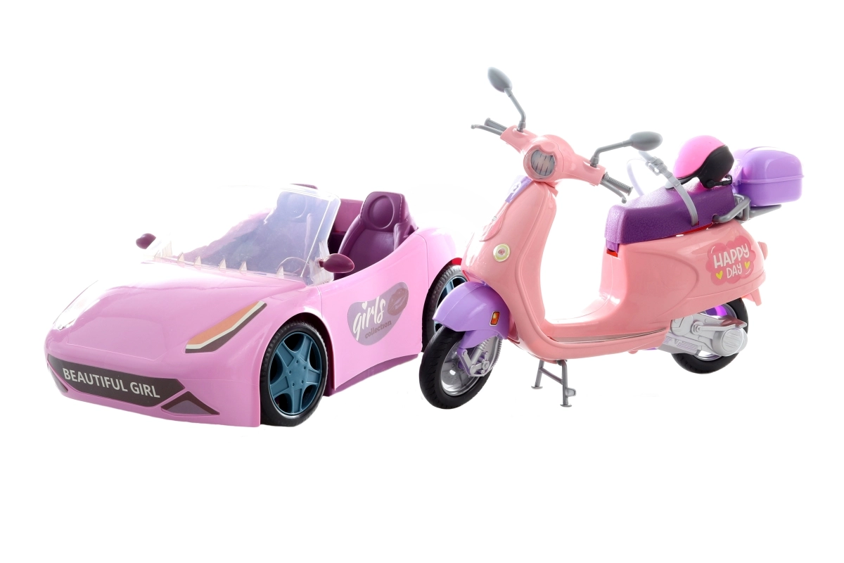 El coche rosa (33 cm), el scooter realista (30 cm) y la bicicleta (17 cm) permiten a las muñecas salir de excursión, ir a la ciudad o al parque. Son fáciles de manejar y fomentan el juego activo.