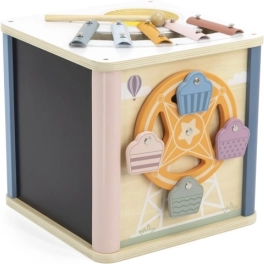 Incluye clasificador de formas, laberinto motriz, espejo, xilófono, pizarra para tizas y más.