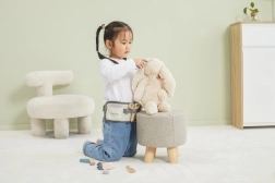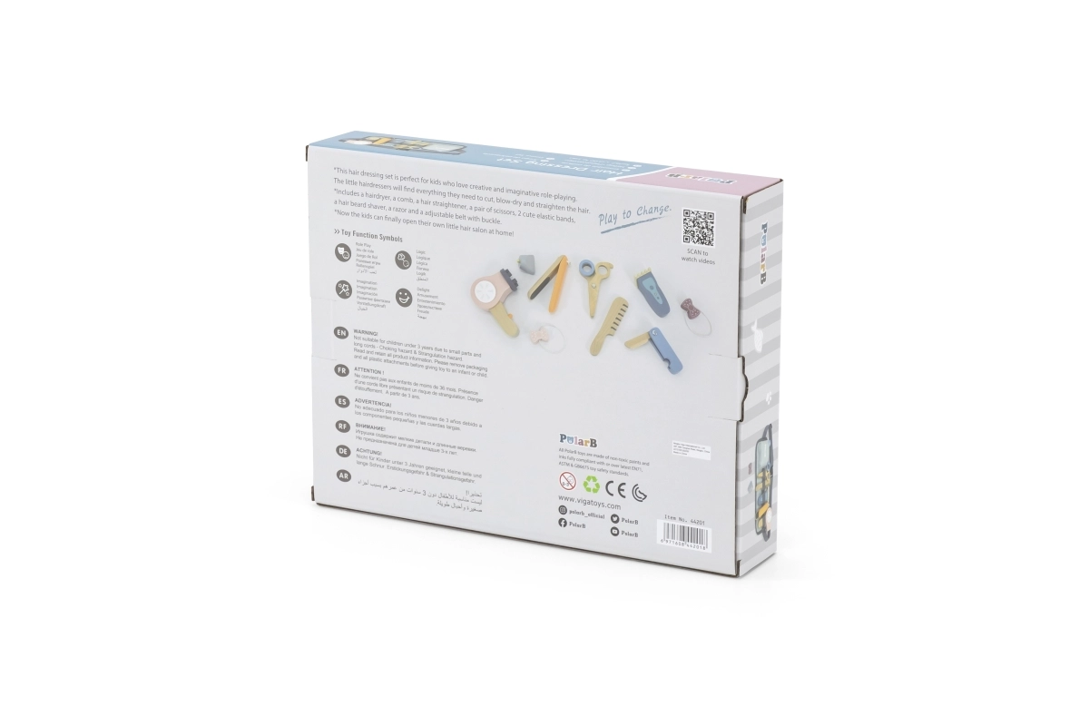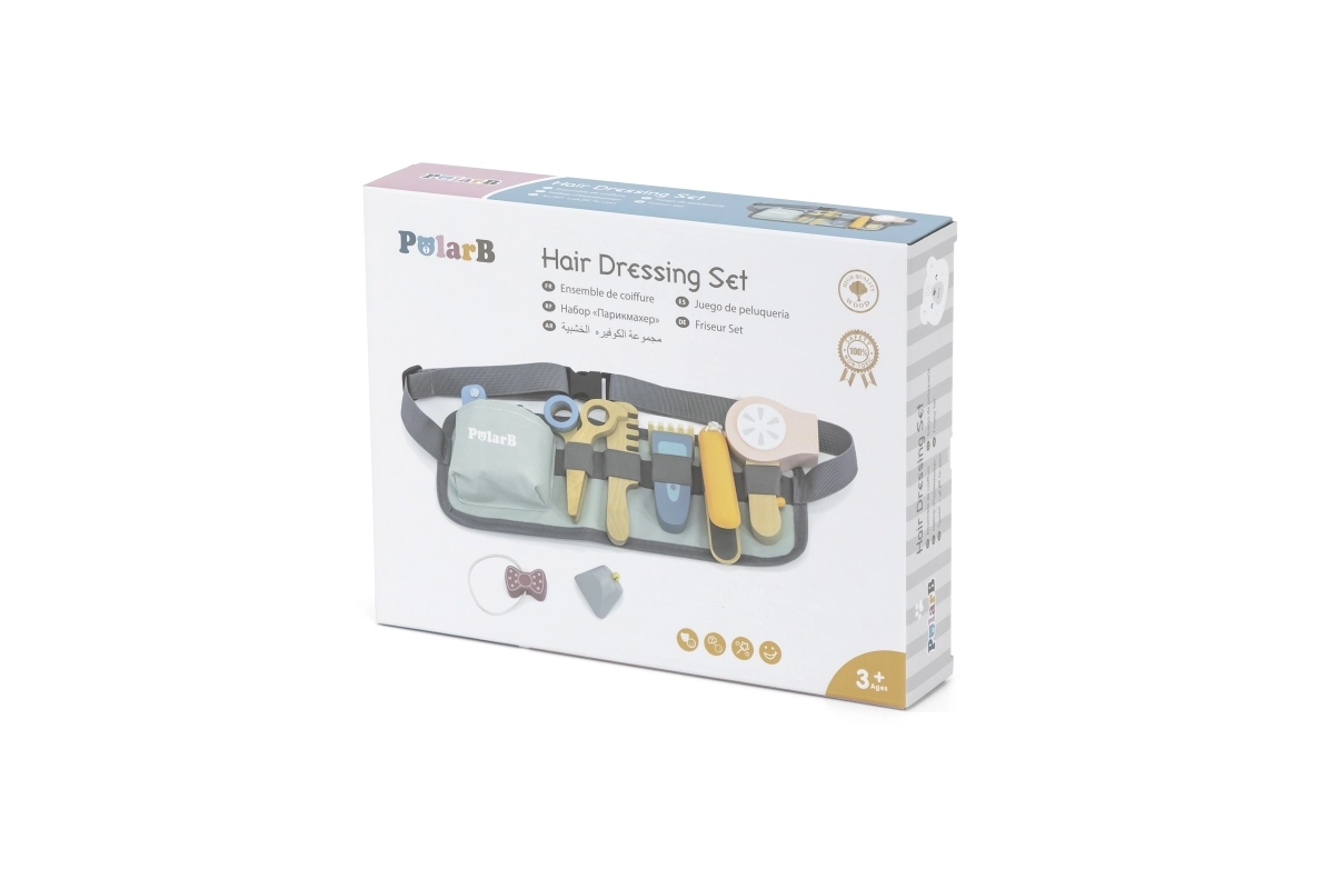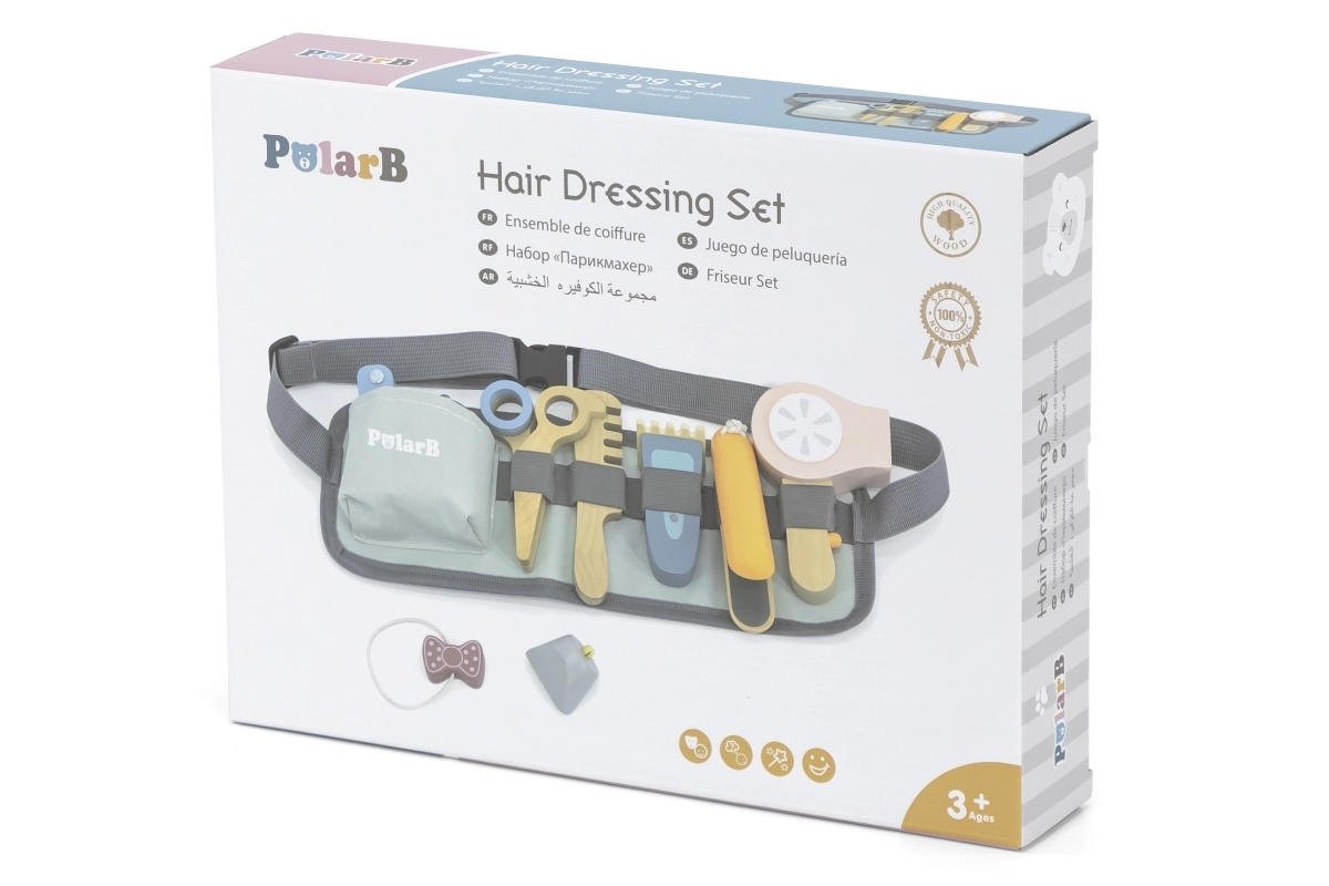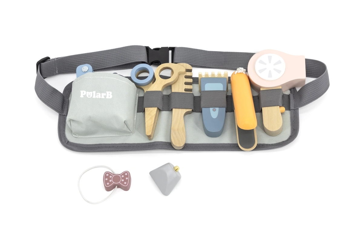 Este set de peluquería está diseñado para que los niños puedan desarrollar su creatividad a través del juego de roles. Incluye diversas herramientas de madera, como secador, peine, plancha para el cabello, tijeras, maquinilla de afeitar y navaja de afeitar. Con un cinturón ajustable, los niños tienen todo lo necesario siempre a mano. Todos los juguetes son seguros y han sido pintados con pinturas no tóxicas sobre madera.