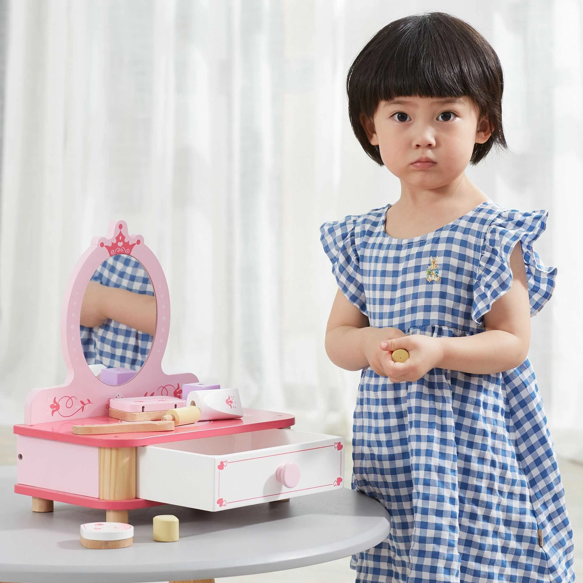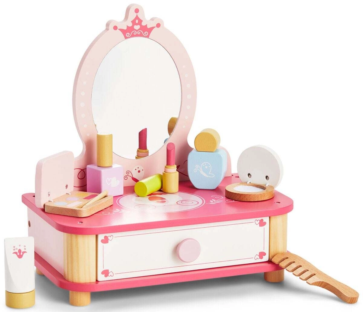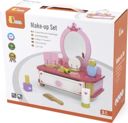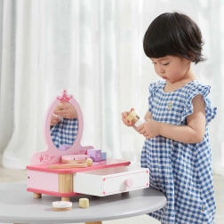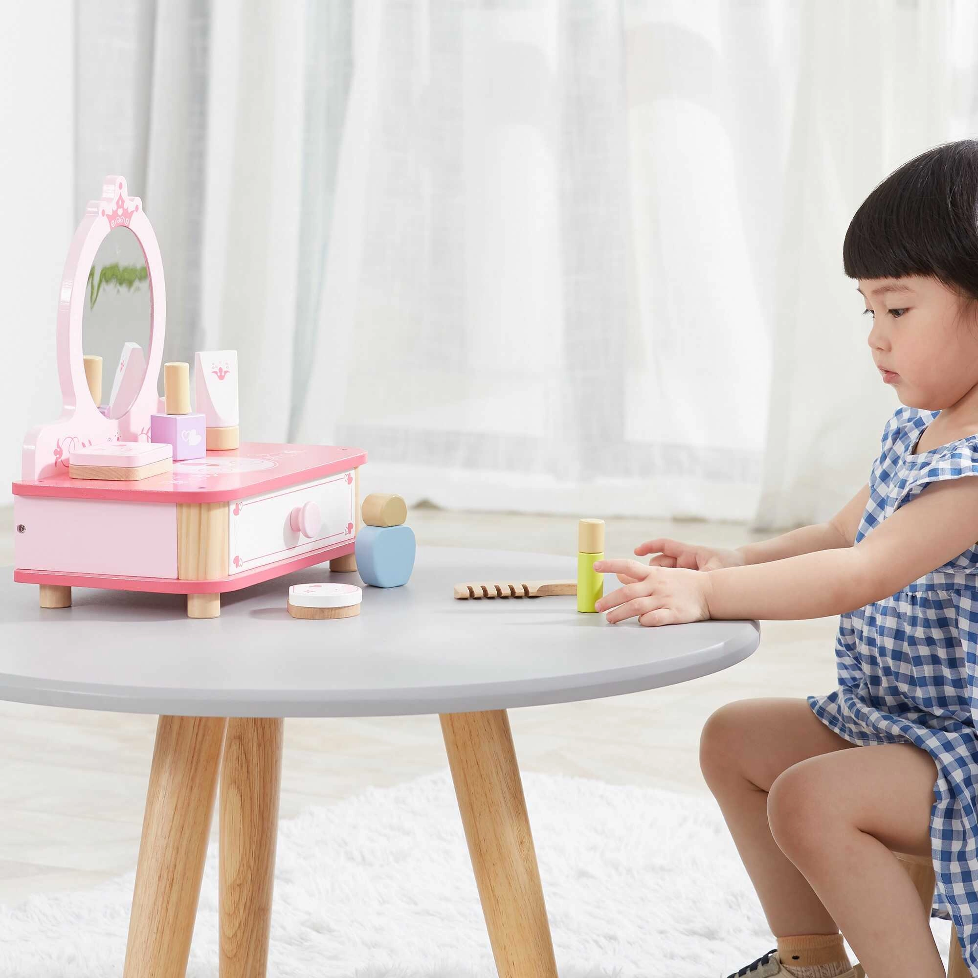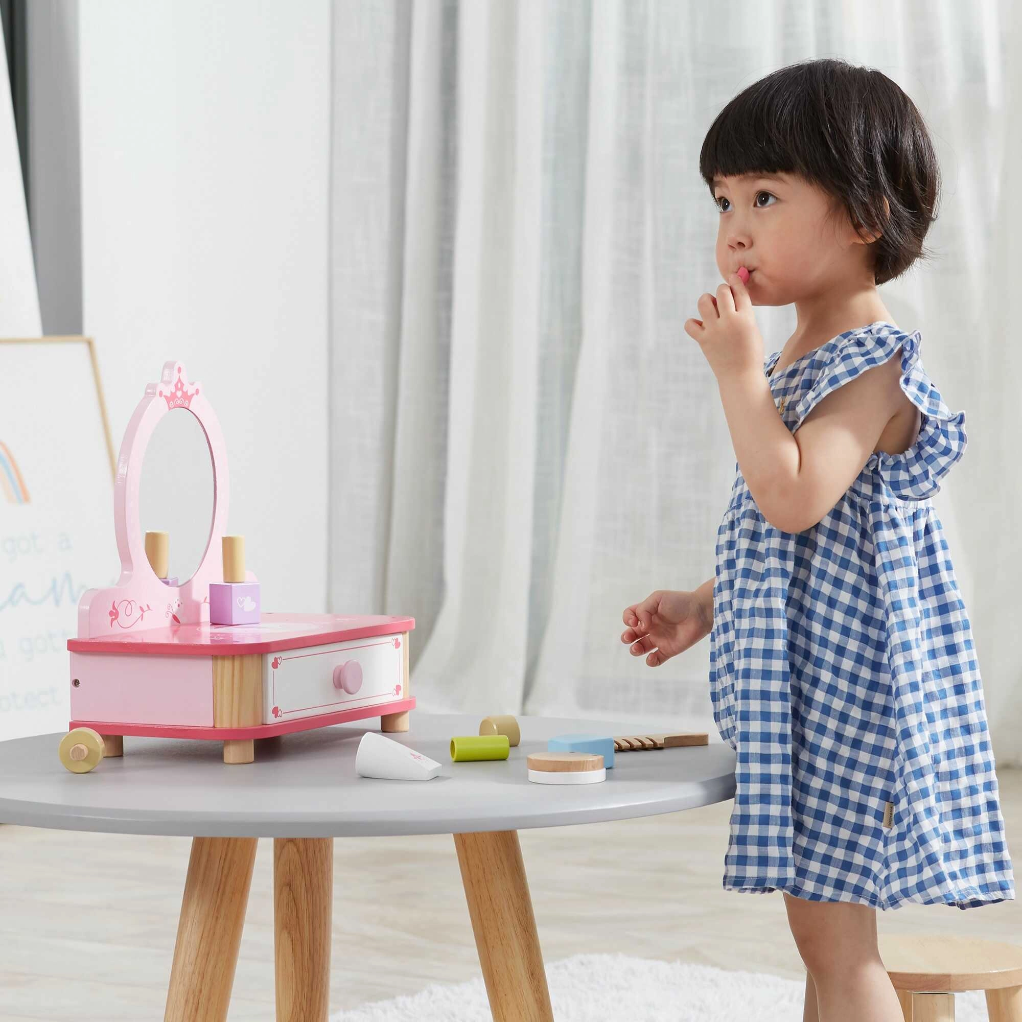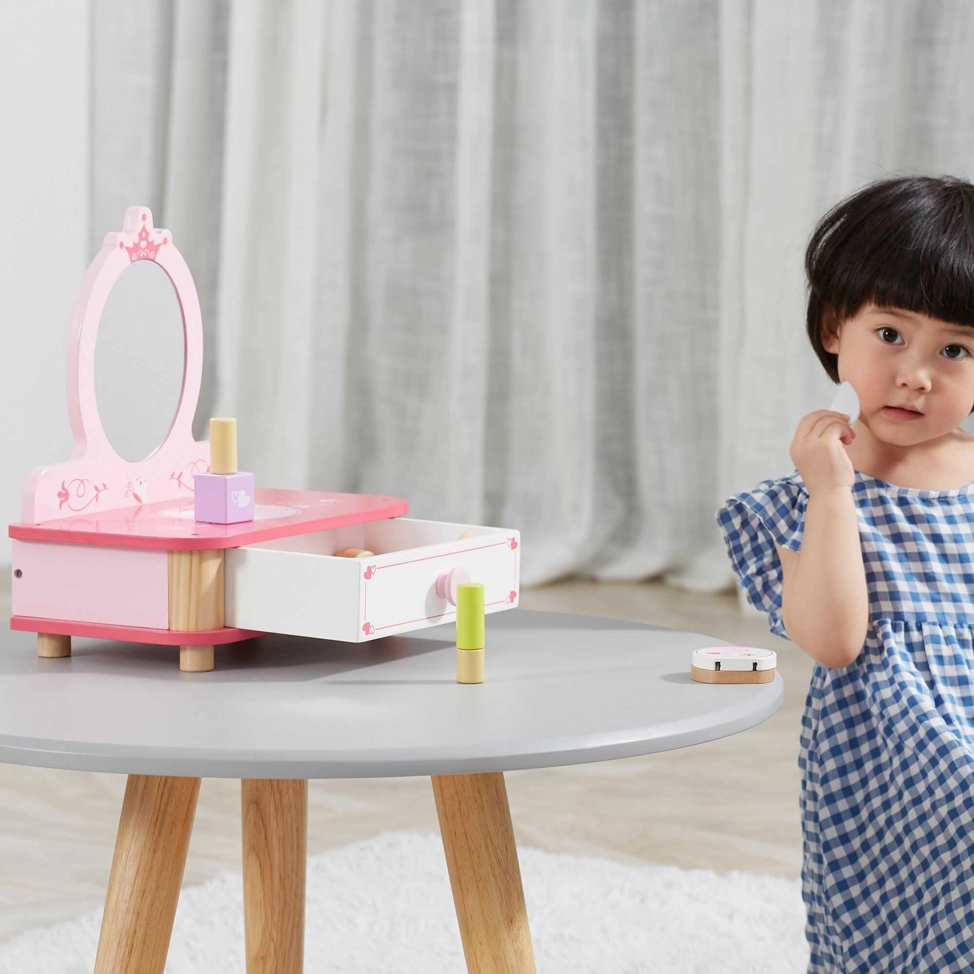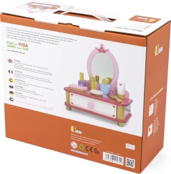 Un precioso tocador rosa de la marca Viga es el complemento ideal para cualquier habitación infantil. El set incluye un espejo, un cajón extraíble y diversos accesorios de madera para crear un mundo mágico lleno de fantasía. Fabricado en madera de alta calidad y pintado con colores no tóxicos seguros para los niños.