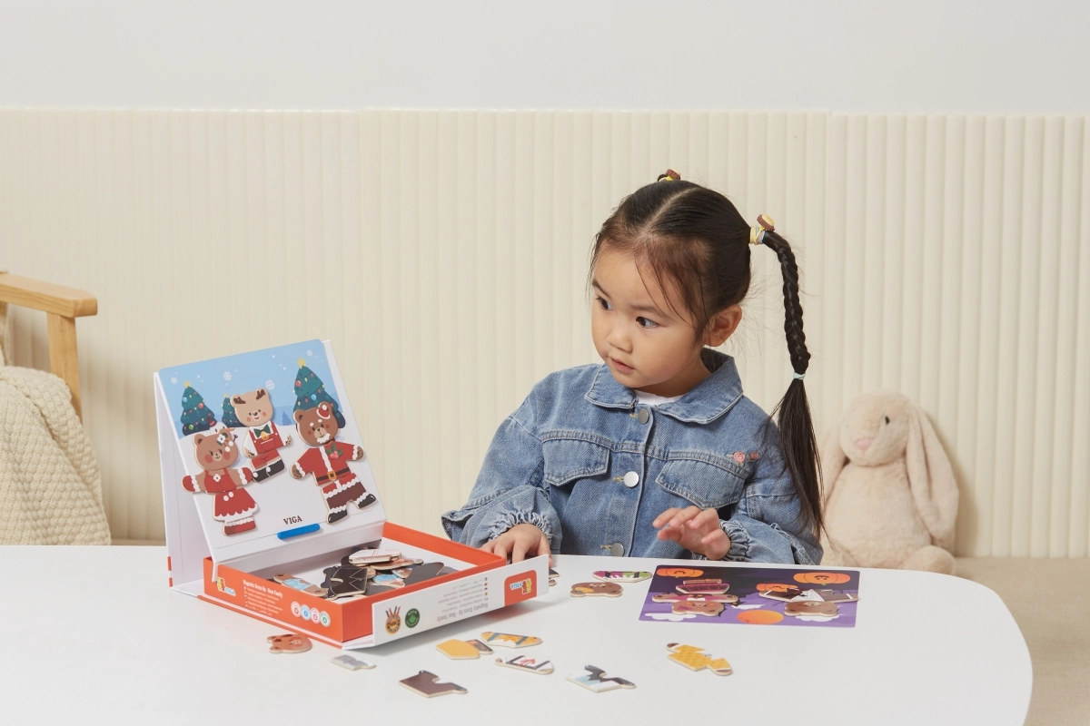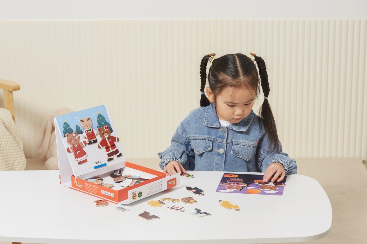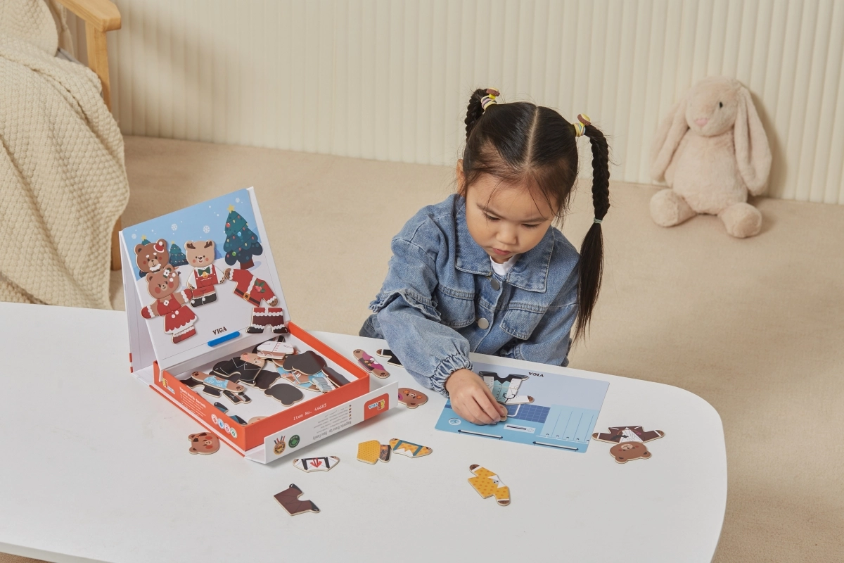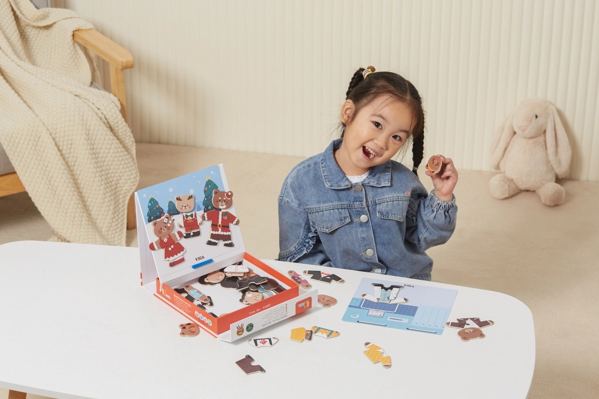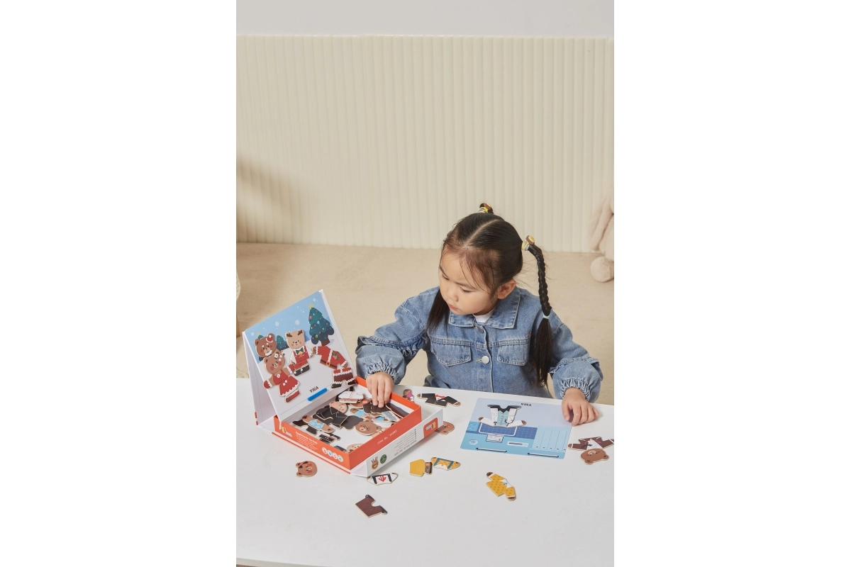 Descubre un divertido set para pequeños creadores: juego de vestir magnético de madera Viga – familia de osos con 54 piezas. Los niños a partir de 3 años ejercitan la motricidad fina, la coordinación mano-ojo y la imaginación al combinar prendas y expresiones. El paquete compacto de 21,5 × 21,5 × 4,5 cm se transporta y guarda fácilmente.