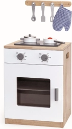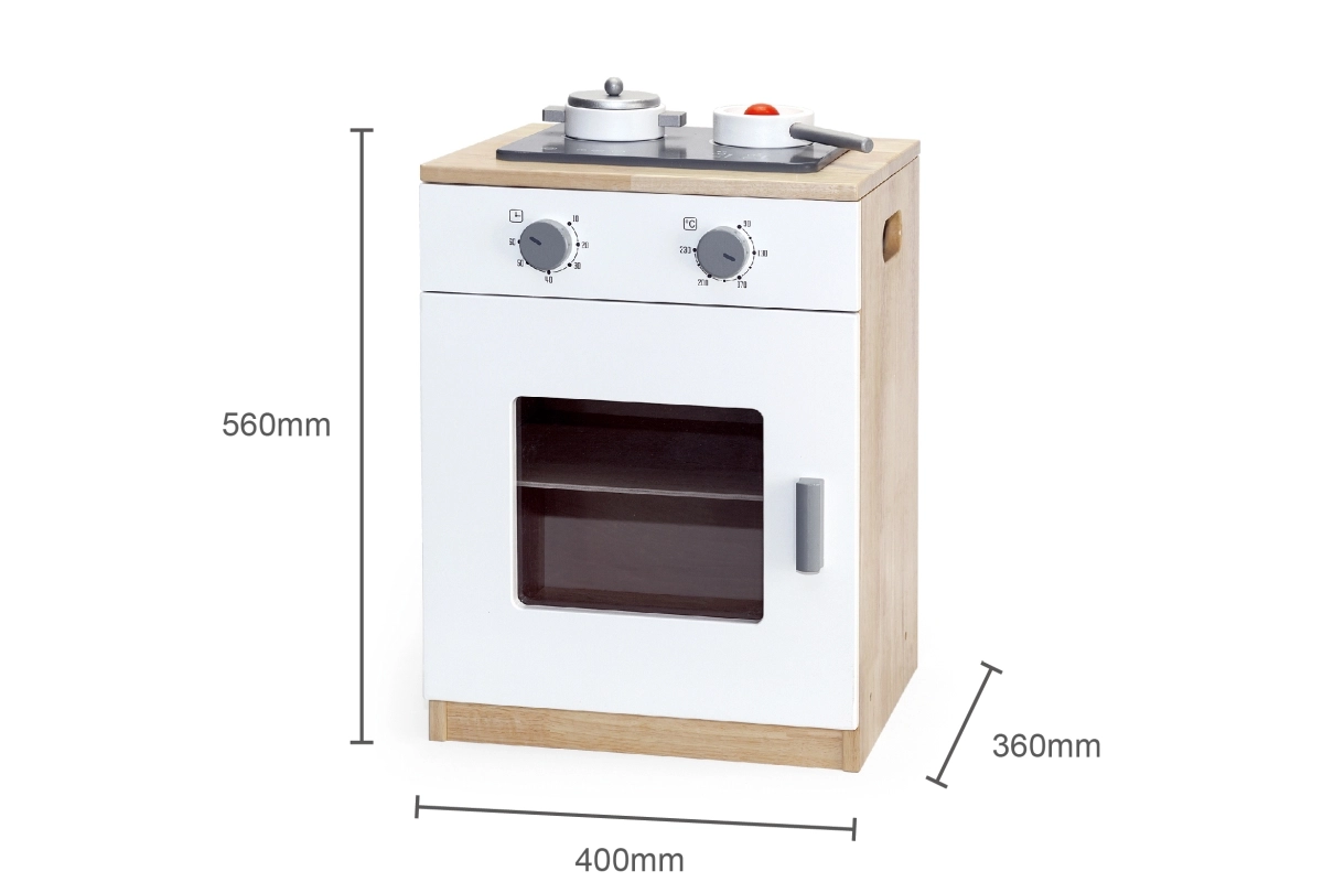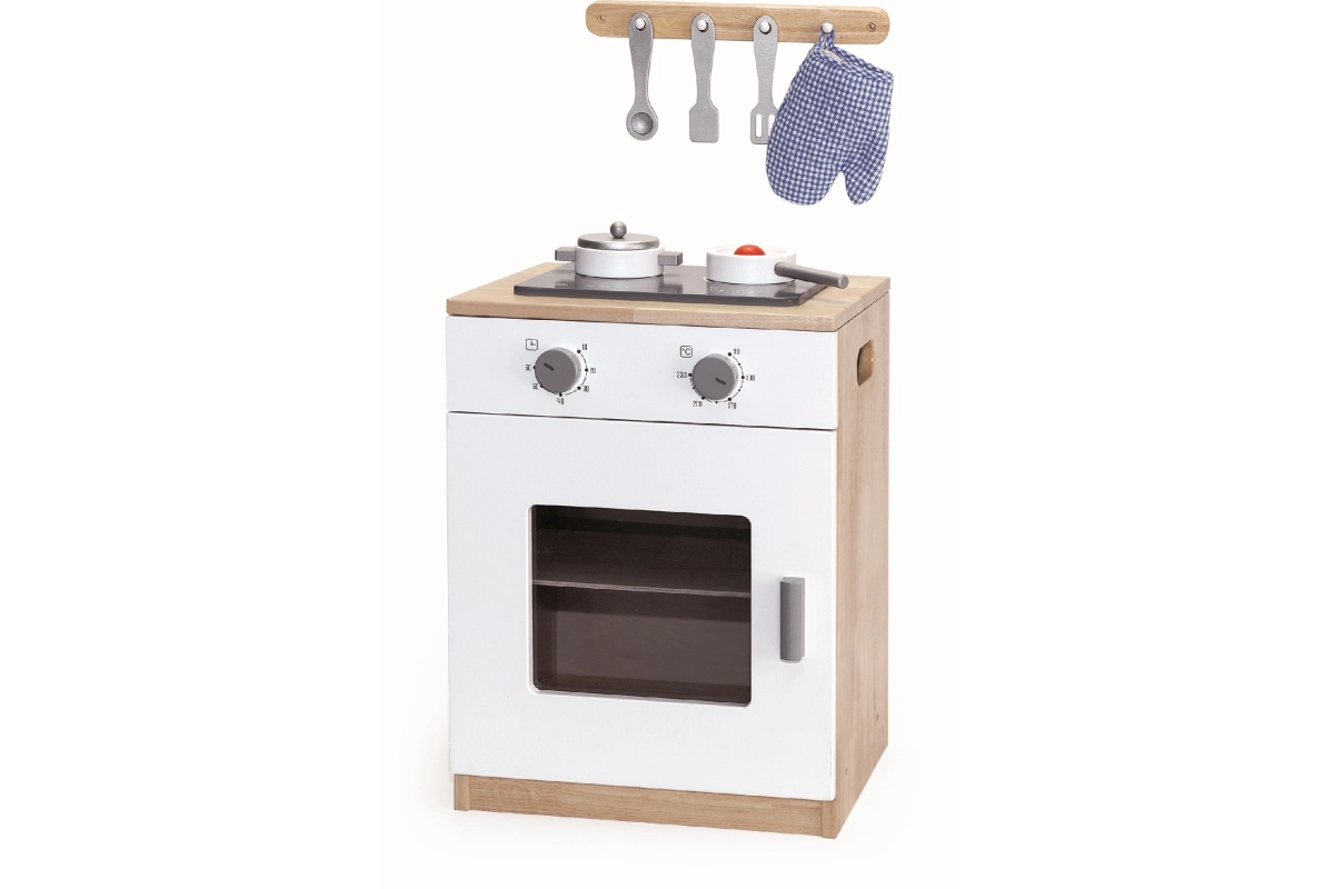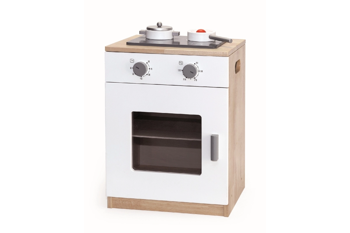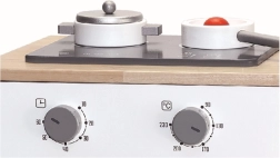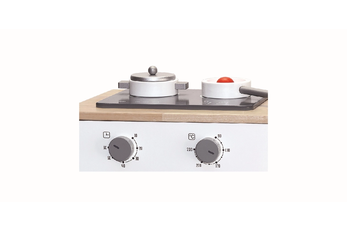 Dos fogones, perillas giratorias y un horno con puerta transparente motivan a los niños al juego creativo y desarrollan su imaginación.