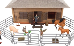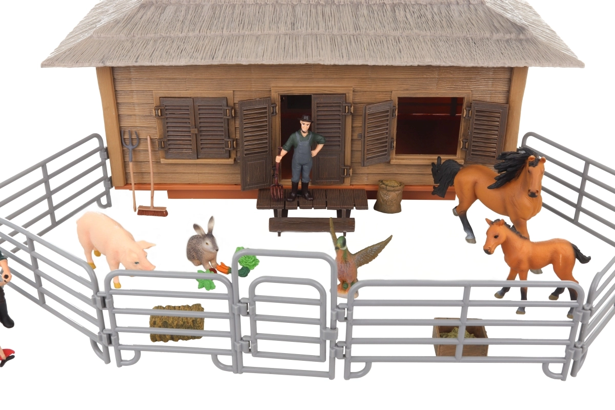 - Establo, corral, 2 figuras de granjeros, 5 animales (caballo, potro, cerdo, pato, conejo), accesorios (p. ej., horca)