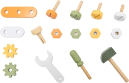 Los niños pueden atornillar, martillar y montar mecanismos sencillos con ruedas dentadas; así entrenan de forma natural la destreza de los dedos, la paciencia y la visión espacial. El set es ideal para el juego independiente o para crear en compañía de los padres.