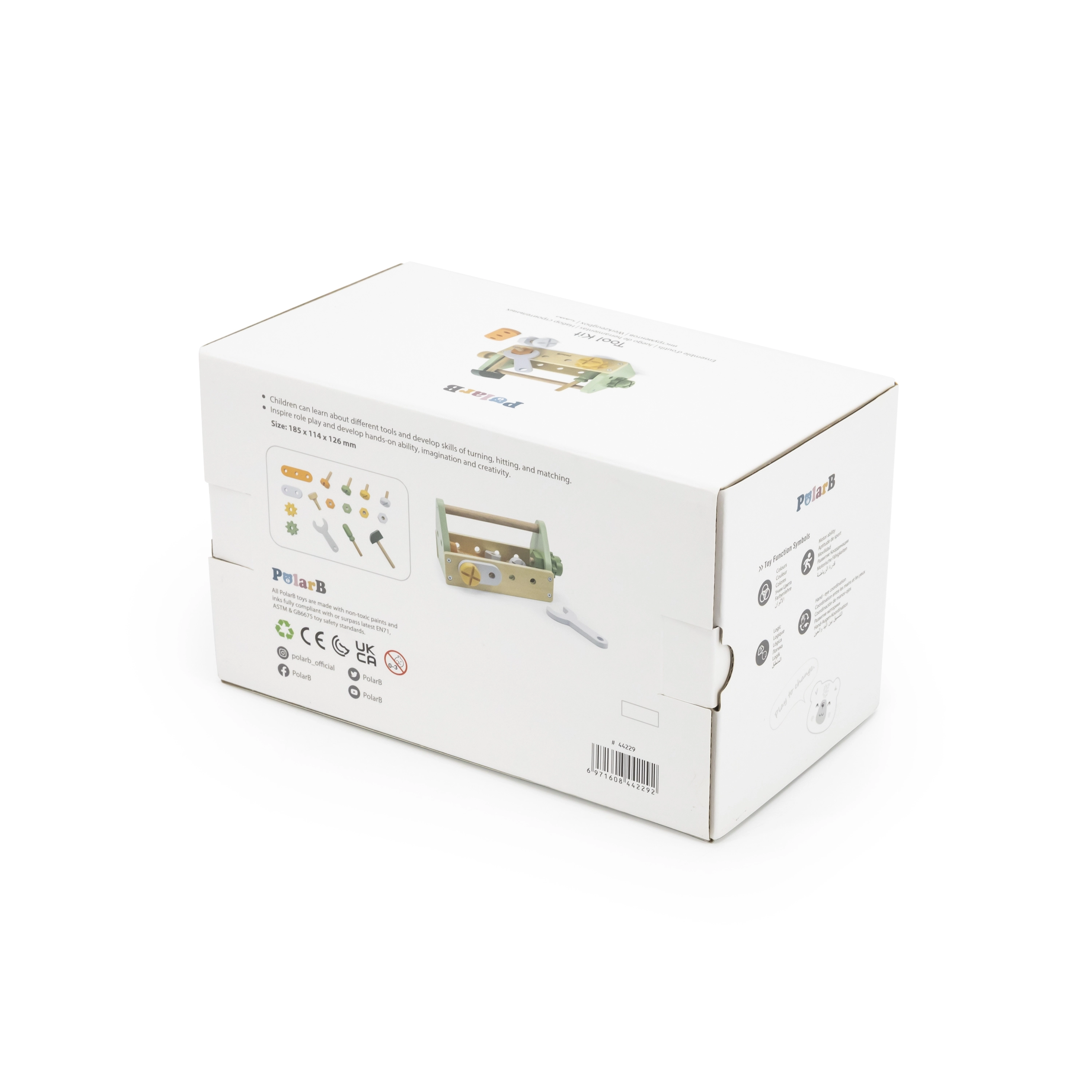 La caja y las herramientas están hechas de madera de alta calidad, sin bordes afilados y con superficies pintadas con colores no tóxicos, para que el juego sea lo más seguro posible para los niños.