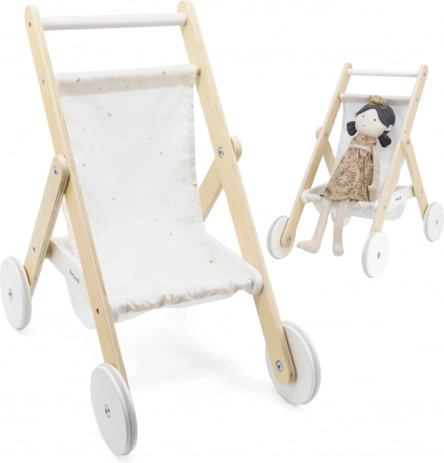 El elegante carrito de madera para muñecas de la línea POLARB de la marca VIGA encantará a cualquier pequeño cuidador. Cuenta con una sólida estructura de madera, asiento textil con estampado de estrellas y luna, cesta de almacenamiento inferior y ruedas de goma para un paseo silencioso y estable. Apto para muñecas de hasta aprox. 38 cm.