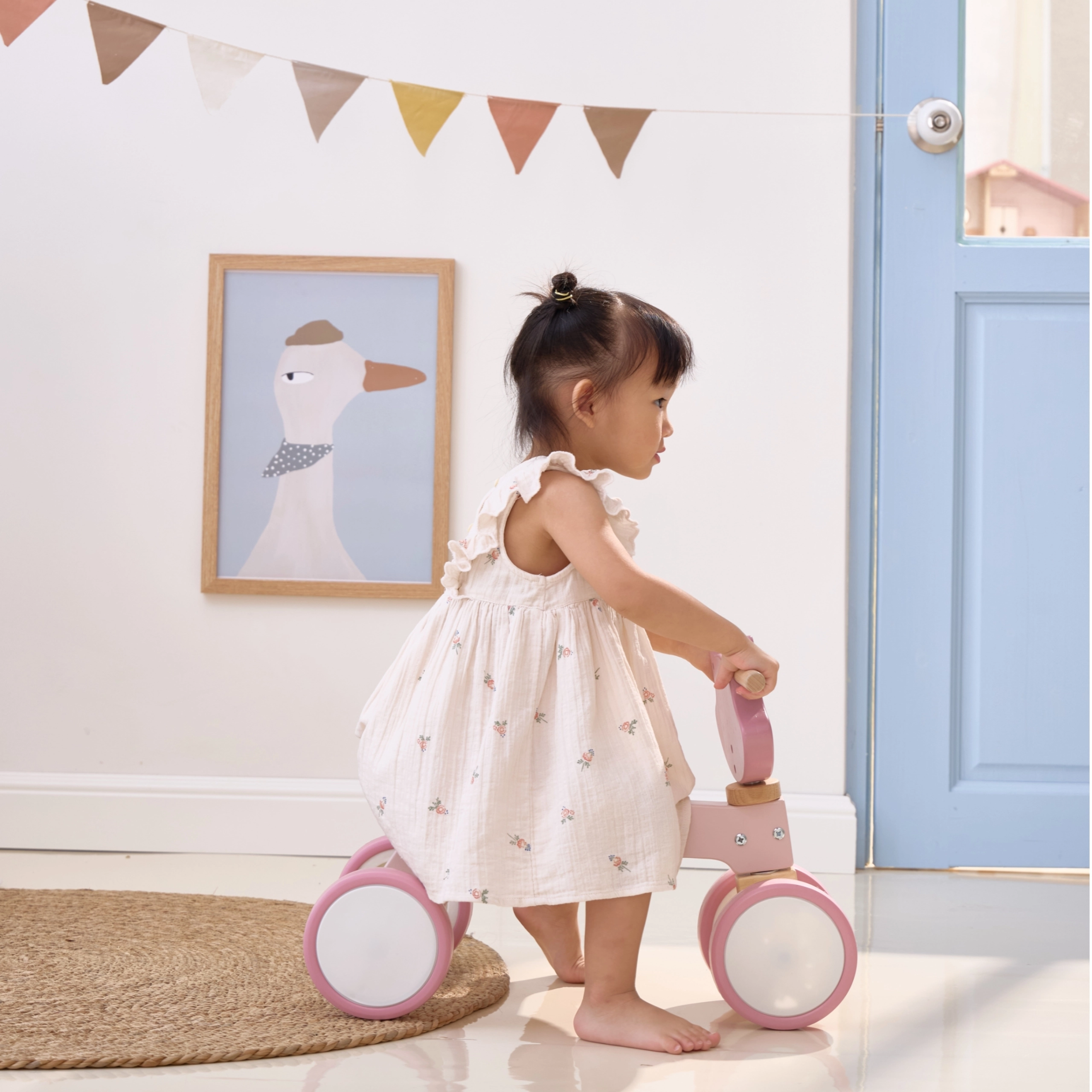 El correpasillos está diseñado pensando en la seguridad: dispone de bloqueo del manillar para evitar giros excesivos, bordes redondeados y un acabado superficial con materiales no tóxicos. Gracias a su bajo peso, se maneja con facilidad y los niños adquieren rápidamente buenos hábitos para mantener el equilibrio y la coordinación de movimientos.