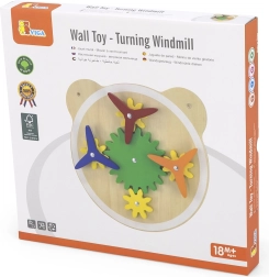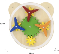 La tabla de madera con forma de cabeza de oso combina cinco engranajes conectados y tres molinillos. Los niños aprenden jugando el principio de causa y efecto: al girar una rueda se ponen en movimiento todas. De forma natural entrenan la motricidad fina, la percepción visual y la colaboración en equipo cuando se turnan en un mismo panel.