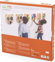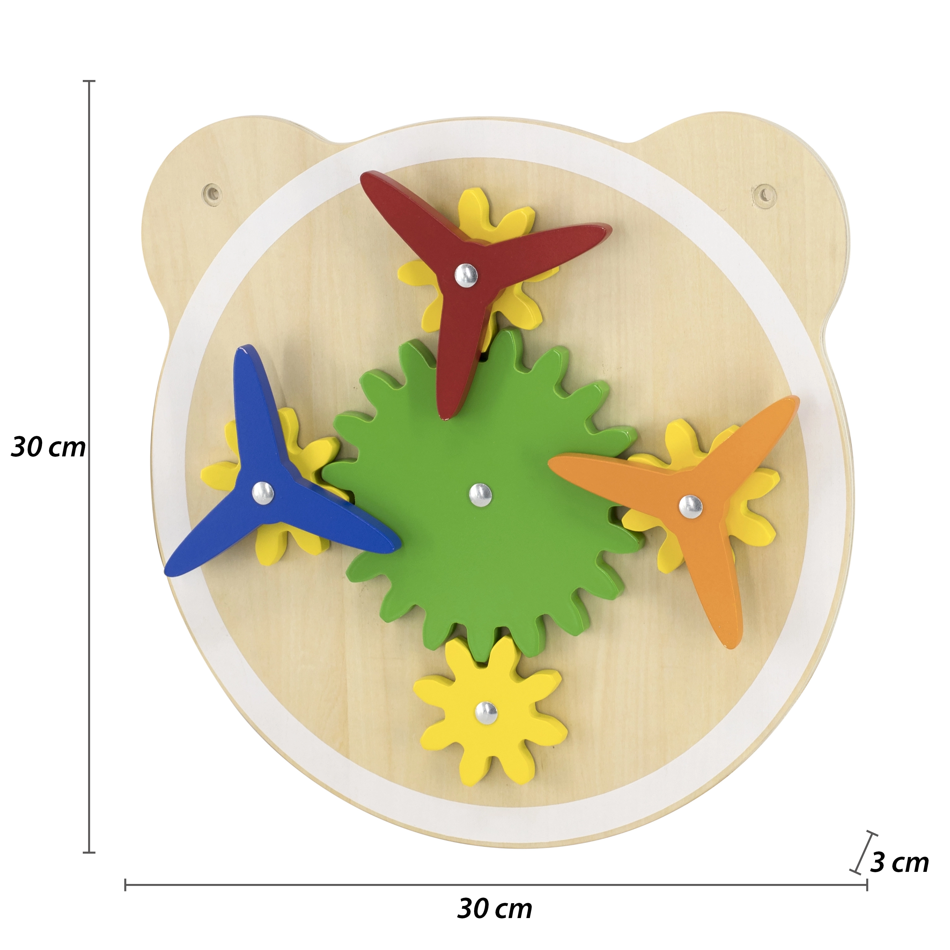 La tabla está hecha de madera lacada y pintada con pinturas seguras y no tóxicas en tonos vivos que llaman la atención de los niños. Es perfecta para el dormitorio infantil, la sala de juegos, así como para guarderías y jardines de infancia. La serie de paneles con osito ofrece diferentes funciones: este modelo se centra en la mecánica de engranajes y la exploración sensorial.