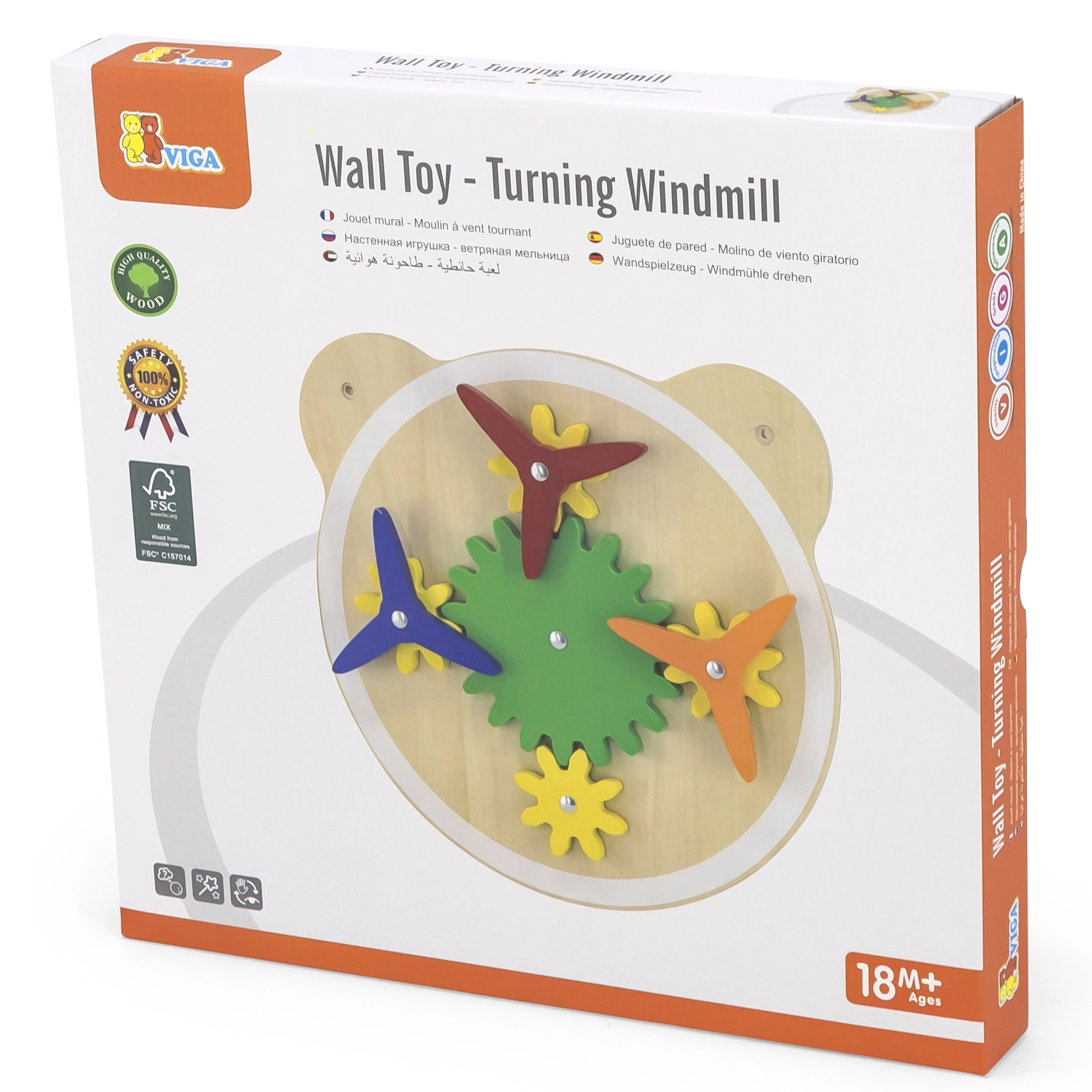 Cinco engranajes de colores y tres molinillos están conectados entre sí. El niño comprende el principio de causa y efecto cuando pone en movimiento todo el mecanismo con un solo giro.