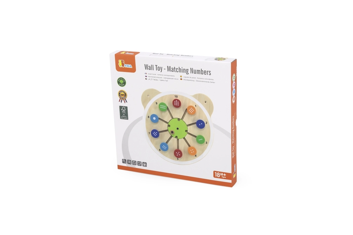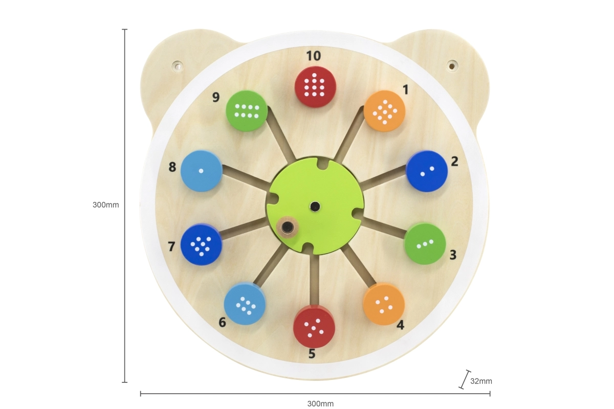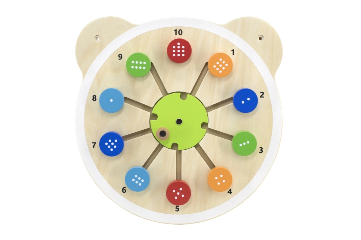 Este juego de pared de madera con forma de cabeza de osito ofrece a los niños una forma lúdica de aprender números y colores. Al deslizar las fichas circulares con puntos hasta las cifras correspondientes, los niños practican el conteo, la discriminación visual y la coordinación ojo–mano. La pizarra está hecha de madera lacada y acabada con pinturas seguras y no tóxicas en tonos vivos que captan la atención de inmediato.
