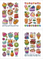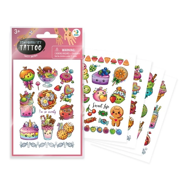 Decora tu cuerpo con preciosos tatuajes de colores inspirados en tus golosinas favoritas. ¡Fácil de aplicar y de retirar! 4 hojas de tatuajes ofrecen una amplia variedad de diseños.