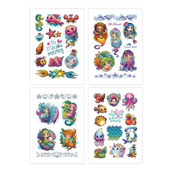 Muestra tu creatividad y tu amor por la vida marina con tatuajes temporales ideales para todas las edades. Solo recorta la imagen, colócala sobre la piel y humedece con agua. Tras 30 segundos, retira el papel y el tatuaje quedará firmemente en su lugar.