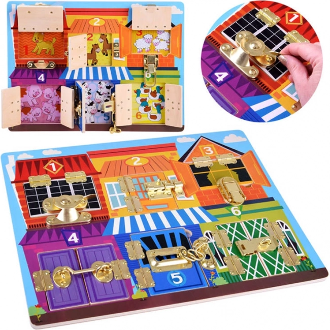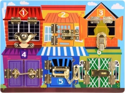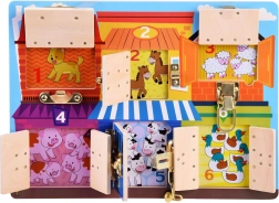 Este tablero manipulativo interactivo ofrece a los niños mucha diversión y aprendizaje en uno. Cada casita de color está marcada con un número y oculta tras su puerta animalitos en la cantidad correspondiente. Así, los niños practican el conteo, el reconocimiento de colores y el pensamiento lógico, mientras abrir distintas cerraduras fortalece la motricidad fina y la coordinación mano-ojo.