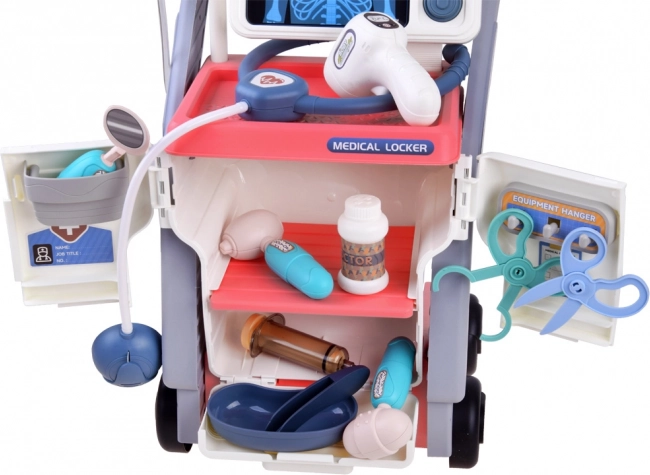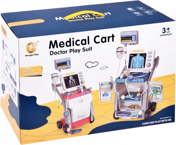 Este carrito médico está completamente hecho de plástico de alta calidad y está diseñado para un juego colorido y divertido. Todas las herramientas son fieles imitaciones de instrumentos médicos reales y tienen formas amigables y colores alegres.
