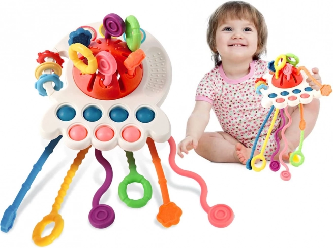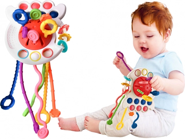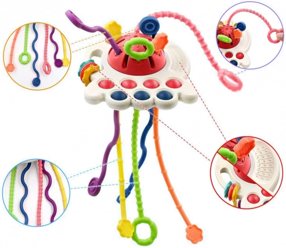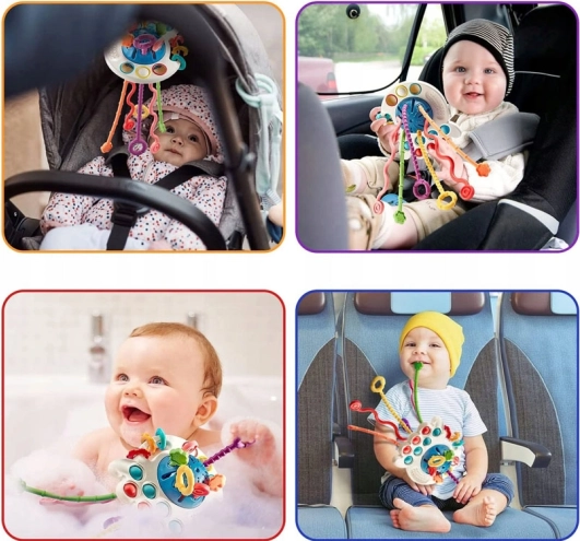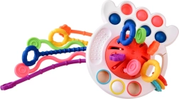 El mordedor especialmente diseñado está equipado con seis cuerdas texturizadas que, al tirarse a través de las aberturas, emiten diferentes sonidos y vibraciones. Esta función ayuda a ejercitar el agarre infantil y desarrolla las habilidades motoras.