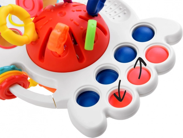 El juguete tiene botones sensomotores suaves que fomentan la manipulación. Los niños pueden disfrutar de distintos estímulos táctiles gracias a tres anillos de plástico con diferentes texturas y a una superficie con un marcado relieve de bolitas.