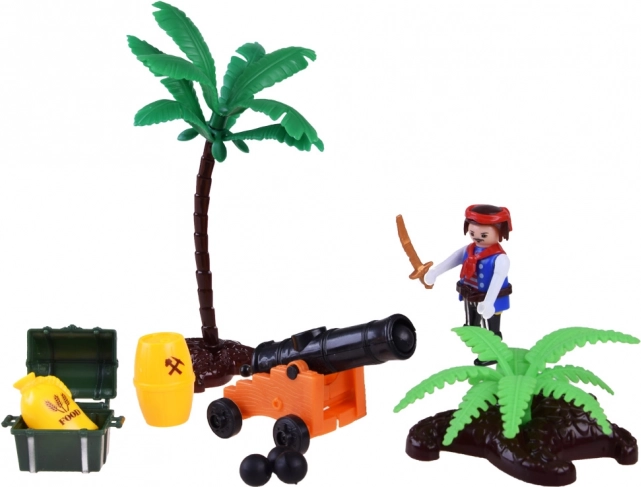 Cuatro figuras diferentes y un compañero animal crean una tripulación llena de vida. Complétalas con el bote, la palmera y los barriles para dar lugar a infinitas historias piratas.