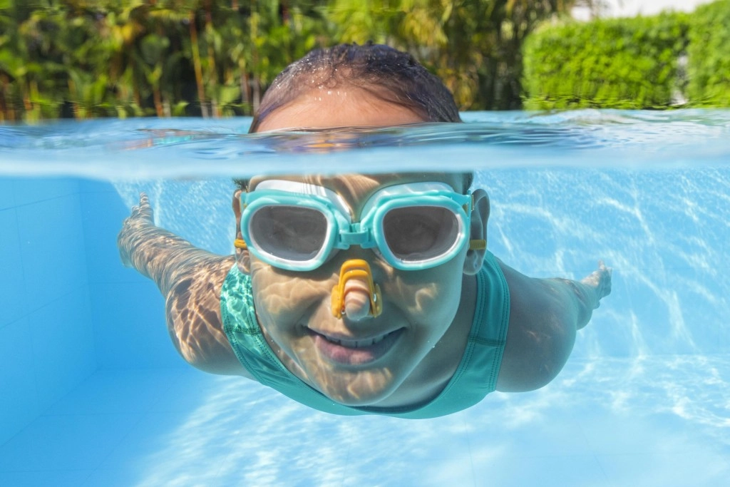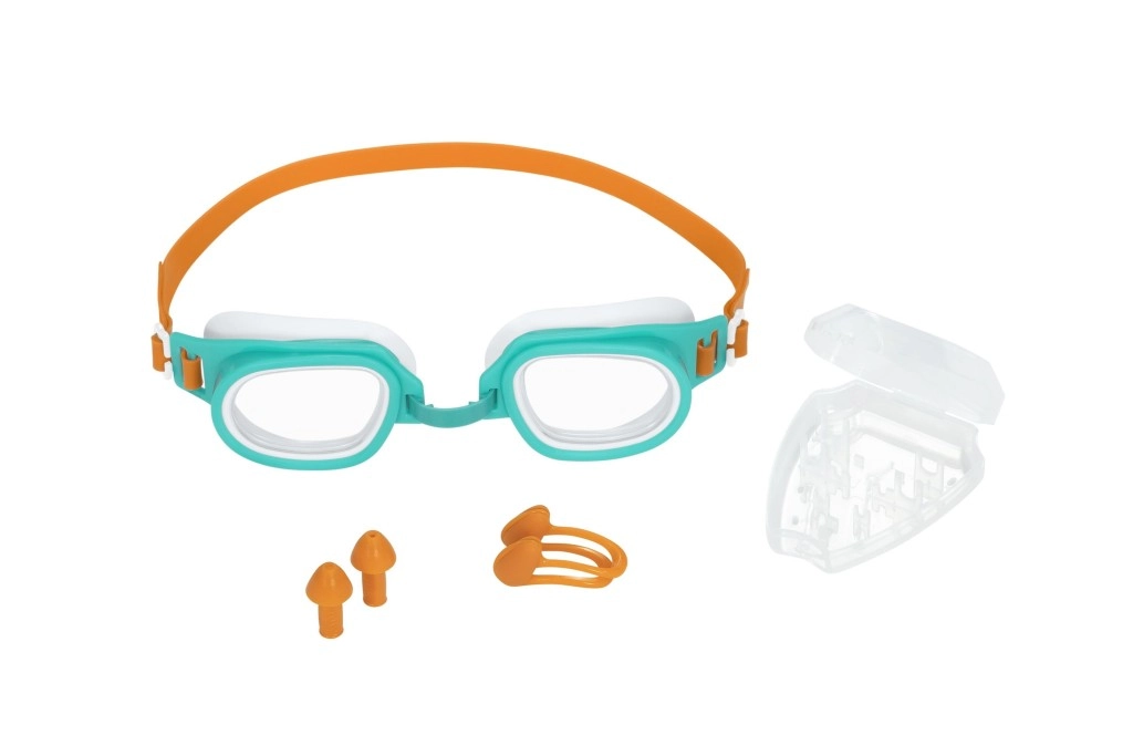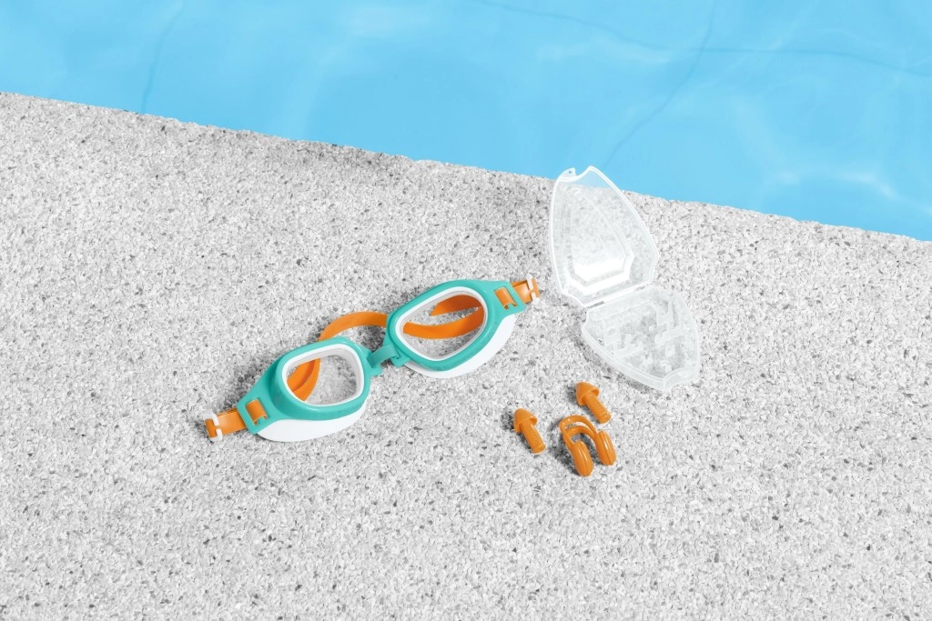 El juego incluye un clip para la nariz y tapones de oídos suaves, diseñados para impedir la entrada de agua.