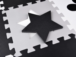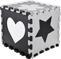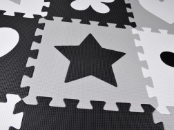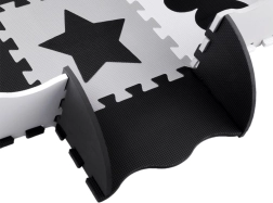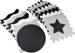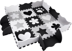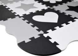 Una alfombra infantil de puzzle de espuma elegante y segura en tonos gris, negro y blanco crea un espacio de juego suave e higiénico. El set incluye 16 piezas grandes con formas extraíbles, acabado antideslizante y aislamiento térmico. Gracias a la posibilidad de conexión también en vertical, se puede crear un pequeño corralito/espacio delimitado para juguetes o pelotas.