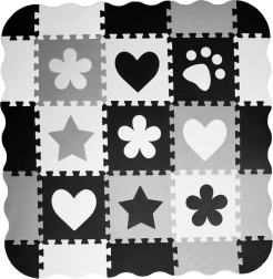 La alfombra de juego de espuma EVA protege del frío del suelo, amortigua caídas y fomenta el desarrollo de la motricidad fina y gruesa. El diseño neutro y de alto contraste con corazones, estrellas y otras formas encaja en cualquier habitación infantil o salón.