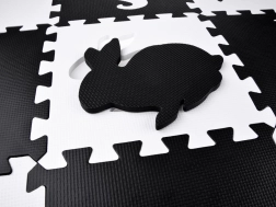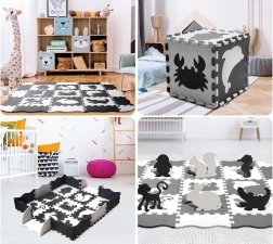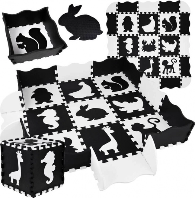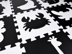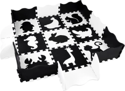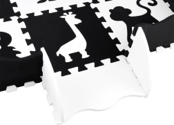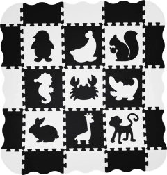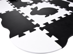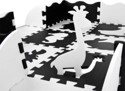 Elegante alfombrilla de espuma en blanco y negro formada por 16 piezas que crea un lugar seguro y cómodo para jugar, tanto para bebés como para niños mayores. Los colores de alto contraste estimulan la vista, la suave espuma EVA amortigua los impactos y la superficie de doble cara con textura antideslizante aumenta la seguridad. Las piezas se pueden combinar libremente, levantar los bordes en altura y así crear un espacio cerrado para juguetes o pelotas.