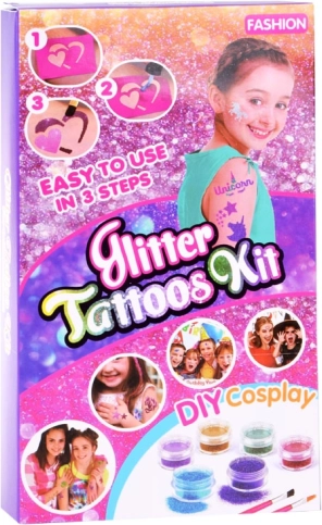 Con este set de tatuajes brillantes puedes crear al instante increíbles tatuajes con brillo. Incluye 120 plantillas de distintos tamaños, 24 botes con bonita purpurina y 2 frasquitos de pegamento, suficiente para muchos tatuajes. También incluye sombras de ojos brillantes y un set de pinceles para un estilo perfecto.