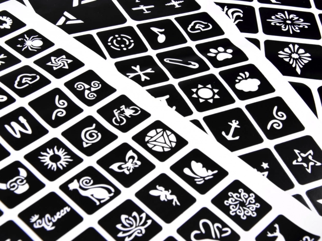 Instrucciones: Elige una plantilla y pégala sobre la piel limpia, aplica el diseño con pegamento, despega la plantilla, añade los colores de purpurina, ¡y listo!