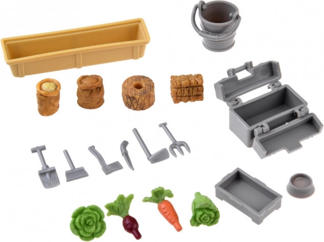 Granero, dependencias agrícolas, molino de viento, farolas, vallas y comederos. No faltan herramientas, sacos de grano, fardos y verduras para un mundo granjero completo.