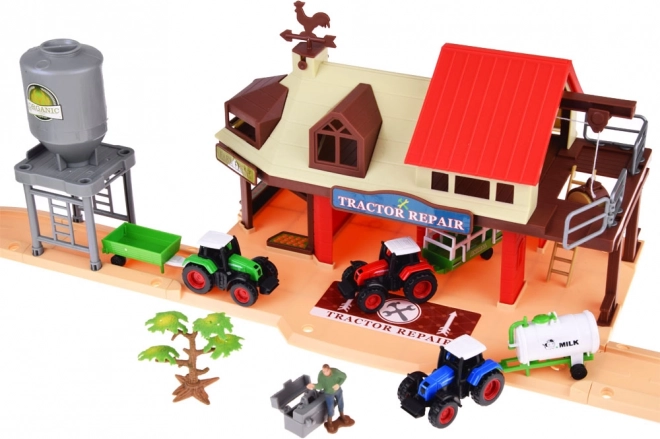 Incluye tres tractores de colores (rojo, azul, verde) con cisterna para leche, volquete con compuerta abatible y remolque para transportar heno o grano: perfectos para un juego realista.