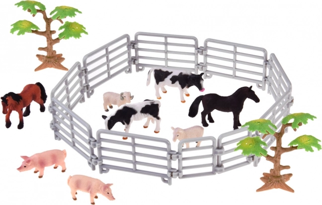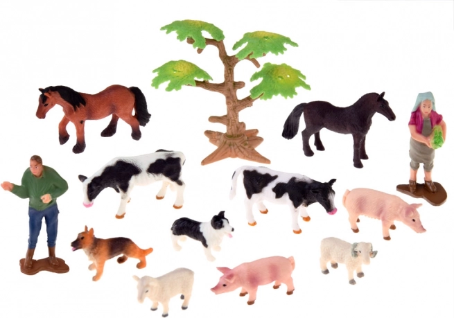 Caballos, terneros, cerditos, oveja con carnero y perros, además del granjero y la ama de casa: todo listo para alimentar, cuidar y vigilar en los corrales.