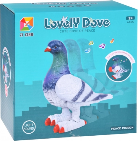 La paloma interactiva puede desplazarse lentamente hacia adelante, bate las alas y parpadea con los ojos, acompañado de una melodía alegre.