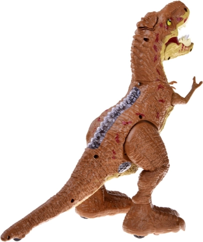El modelo está diseñado con atención a los detalles realistas, cuenta con elementos luminosos en el lomo y boca iluminada en rojo. En la caja encontrarás todo lo necesario: mando RC, pulsera con sensor, batería 3,7 V 500 mAh, cargador USB, destornillador y cuentagotas para añadir agua y lograr el efecto de vapor.