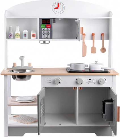 Esta cocina infantil está estéticamente elaborada y no solo garantiza una excelente diversión, sino que también contribuye al desarrollo del niño. A los niños les encanta imitar a los adultos y esta cocina les permite jugar a cocinar, limpiar y otras actividades relacionadas con el funcionamiento del hogar.