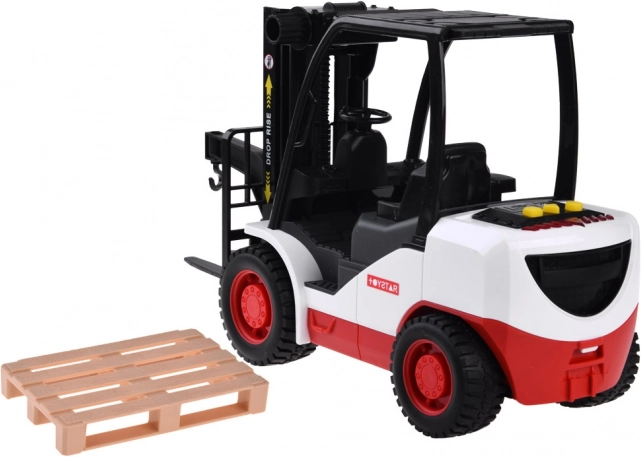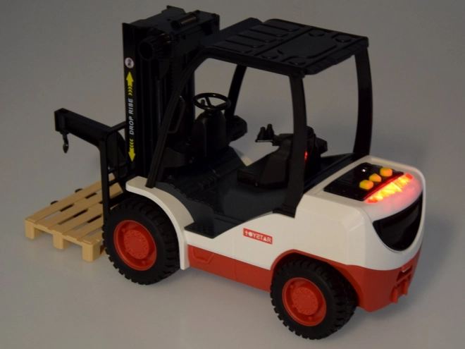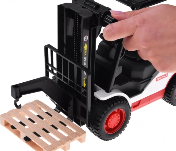 La carretilla elevadora está fabricada con precisión en plástico y diseñada para parecer una máquina real. Dispone de propulsión por fricción, que permite su movimiento sobre superficies planas. Incluye diferentes efectos de sonido, como arranque del motor, sonido de trabajo y sonido de marcha atrás.
